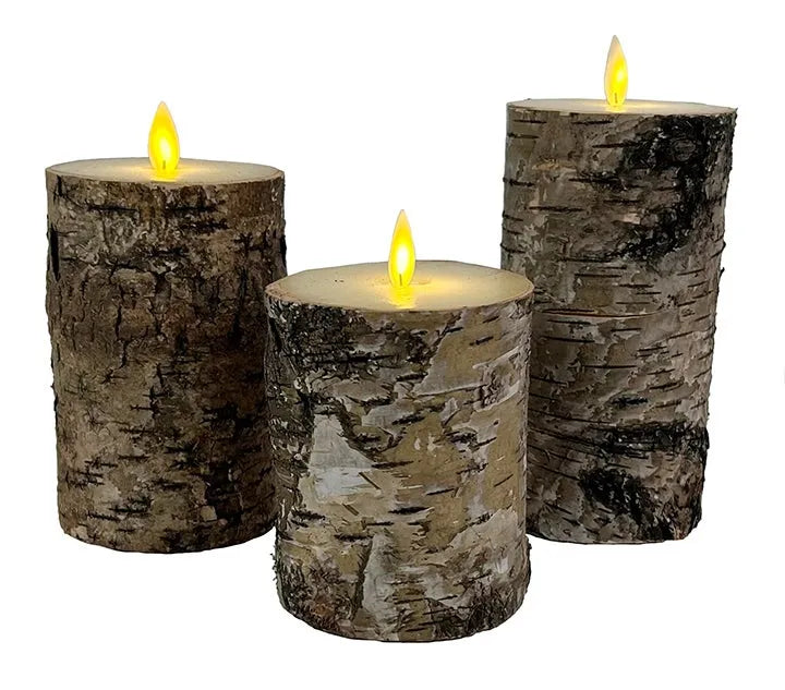 Battery operated, flickering LED flameless candle wrapped in real bark. Quality candle is made from real wax with a 4 hour timer – on for 4/off for 20. Requires 2-AA batteries, not included.