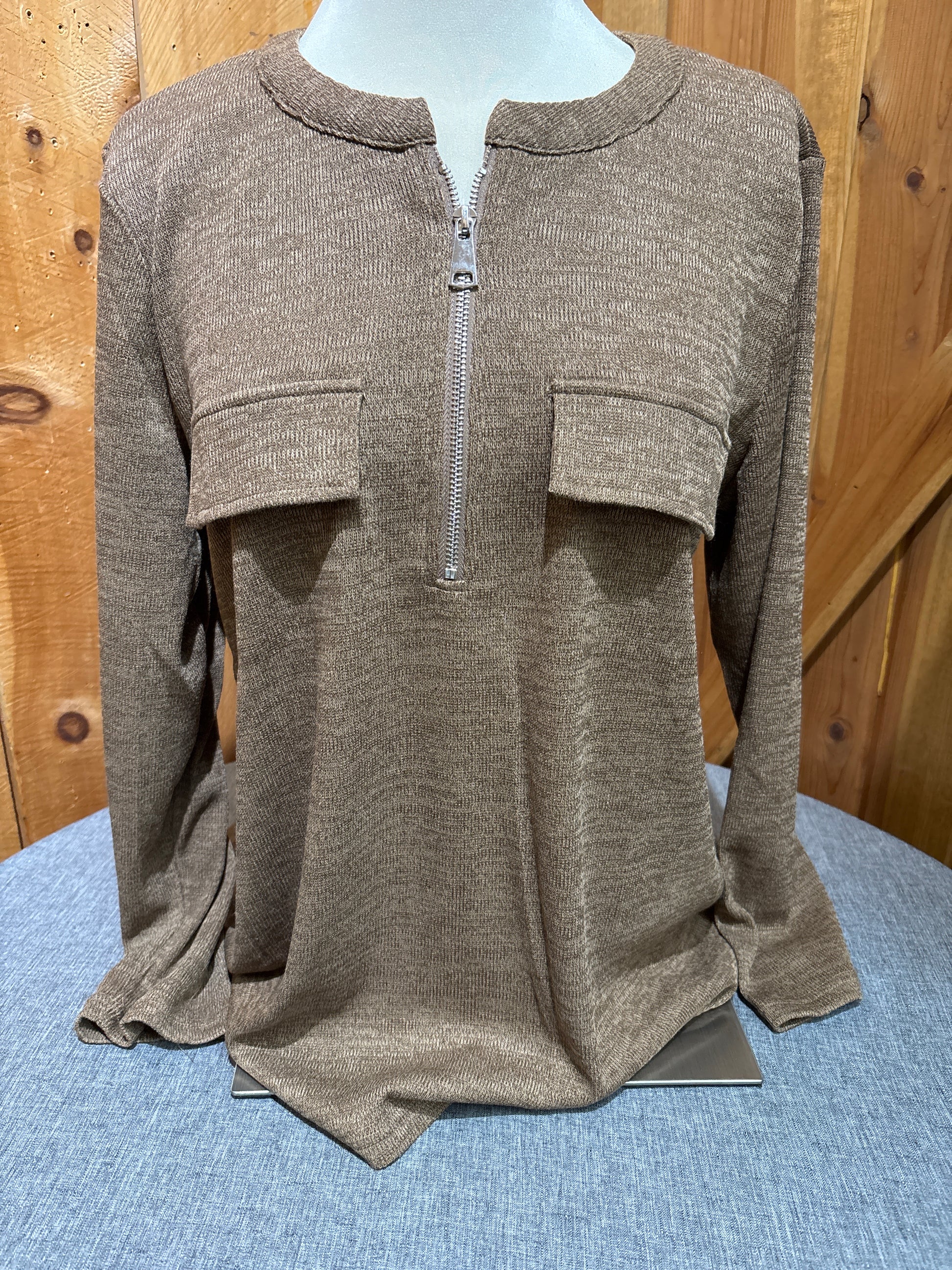 Creation Brown Double Pocket Half Zip Long Sleeve Top
