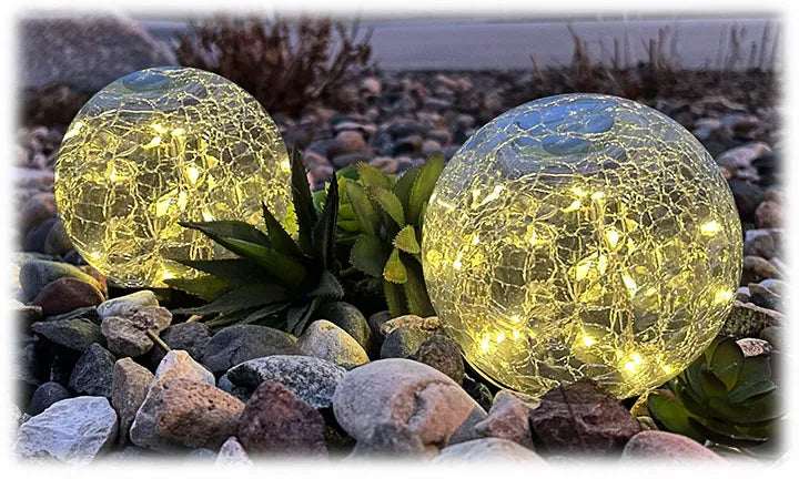This elegant glass globe features a crackled design and is illuminated by a warm white 30-LED light strand inside. The solar panel, along with an included rechargeable battery, captures sunlight during the day and automatically turns the lights on at dusk, turning off once the stored energy is depleted. Each globe includes a removable 4.25″ stake for easy placement in the ground or in a pot. Sold as a set of 2. When using Solar globes, ensure the base is securely tightened after altering the string of lights inside the ball. This prevents moisture from entering the solar panel and helps keep the item sealed. Moisture is a common issue that can cause the lights to stop functioning.